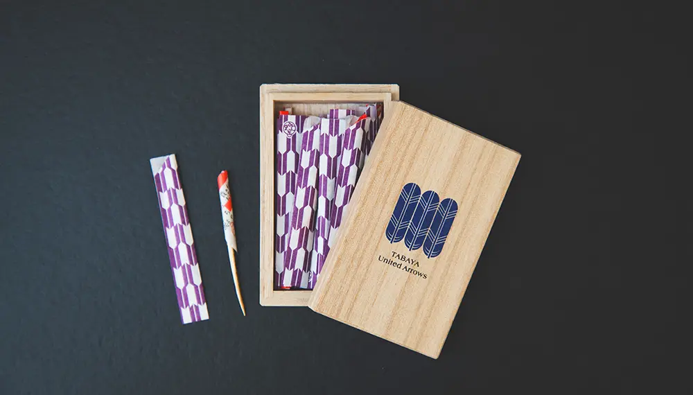 Gli stuzzicadenti del negozio Saruya di Nihonbashi, fondato nel 1704, sono realizzati a mano uno ad uno dagli artigiani e, con soli 400 stuzzicadenti prodotti in un giorno, sono molto preziosi. Fatti con un legno che sprigiona il suo aroma quando vengono rotti, erano considerati un souvenir raffinato durante il periodo Edo (1603-1867). Quelli venduti qui hanno un involucro di carta con un disegno a frecce piumate – un tradizionale motivo giapponese. La scatola di stuzzicadenti in legno di pawlonia raffigura una "tabaya" (fascio di frecce) simboleggiante il nome del negozio, ed è un articolo esclusivo di Tabaya United Arrows.
