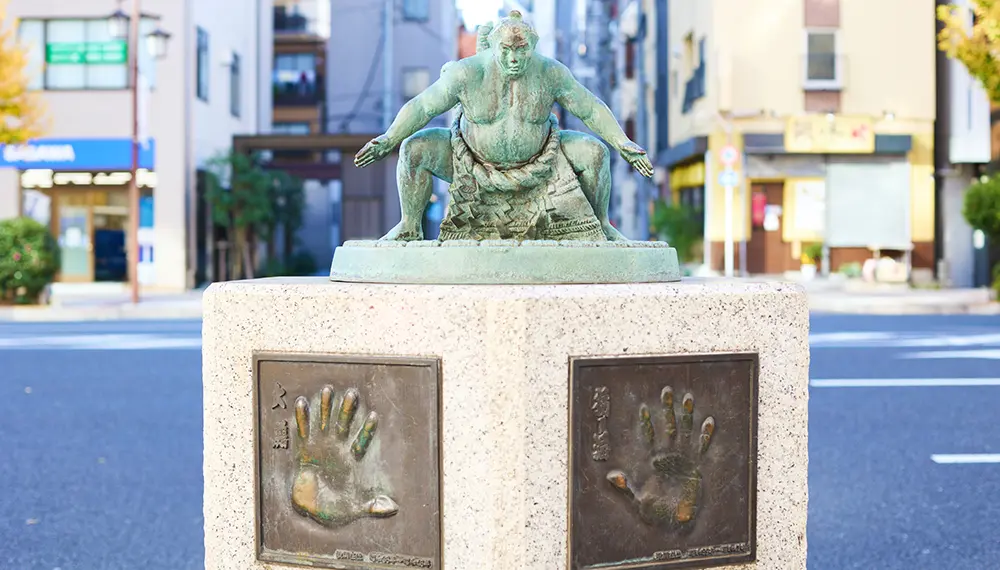 A pochi passi dall’uscita ovest della stazione Ryogoku c’è la via del Kokugikan, una strada fiancheggiata da statue di bronzo dei lottatori di sumo in varie pose. Queste vanno da potenti posture a gesti cerimoniali. Sui piedistalli ci sono le impronte nel bronzo delle mani degli ex-Yokozuna, i lottatori di rango più elevato del sumo professionista. Fanno capire al tatto quale fosse la forza dei lottatori più prestigiosi.