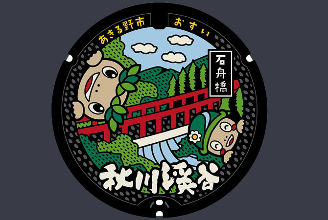 Il design di questi tombini è ispirato a "Morikko San-chan", mascotte ufficiale della municipalità di Akiruno, e ai "festival" di questa località. Il personaggio di "Morikko San-chan", ispirato alla salamandra di Tokyo (Hynobius tokyoensis), vive nei boschi di Akiruno, famosi per la loro vegetazione e i loro prodotti naturali. I festival che si tengono al Santuario Ninomiya, al Santuario Shoichi Iwabashi e al Santuario Akiru, conosciuti come i "Tre Grandi Festival di Akiruno", sono festival storici frequentati da un gran numero di visitatori.