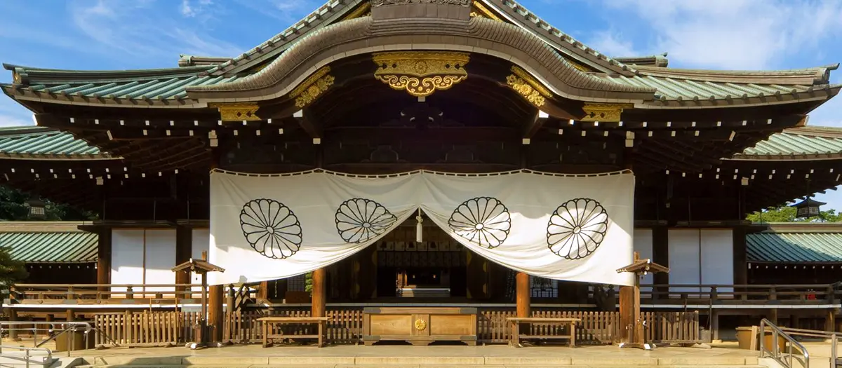 Il santuario Yasukuni fu fondato nell'anno 2 dell'era Meiji (1869). Sono venerate qui le 2.466.000 anime dei morti in battaglia dalla fine del periodo Edo fino alla Seconda Guerra Mondiale. Il museo all'interno del recinto espone ultime volontà e reliquie appartenute ai caduti e materiale storico correlato. È da sempre un luogo famoso per i fiori di ciliegio, con i suoi circa 500 alberi. Ogni anno, lo staff dell’Osservatorio Meteorologico della Prefettura di Tokyo visita il sito per elaborare le previsioni sulla fioritura.