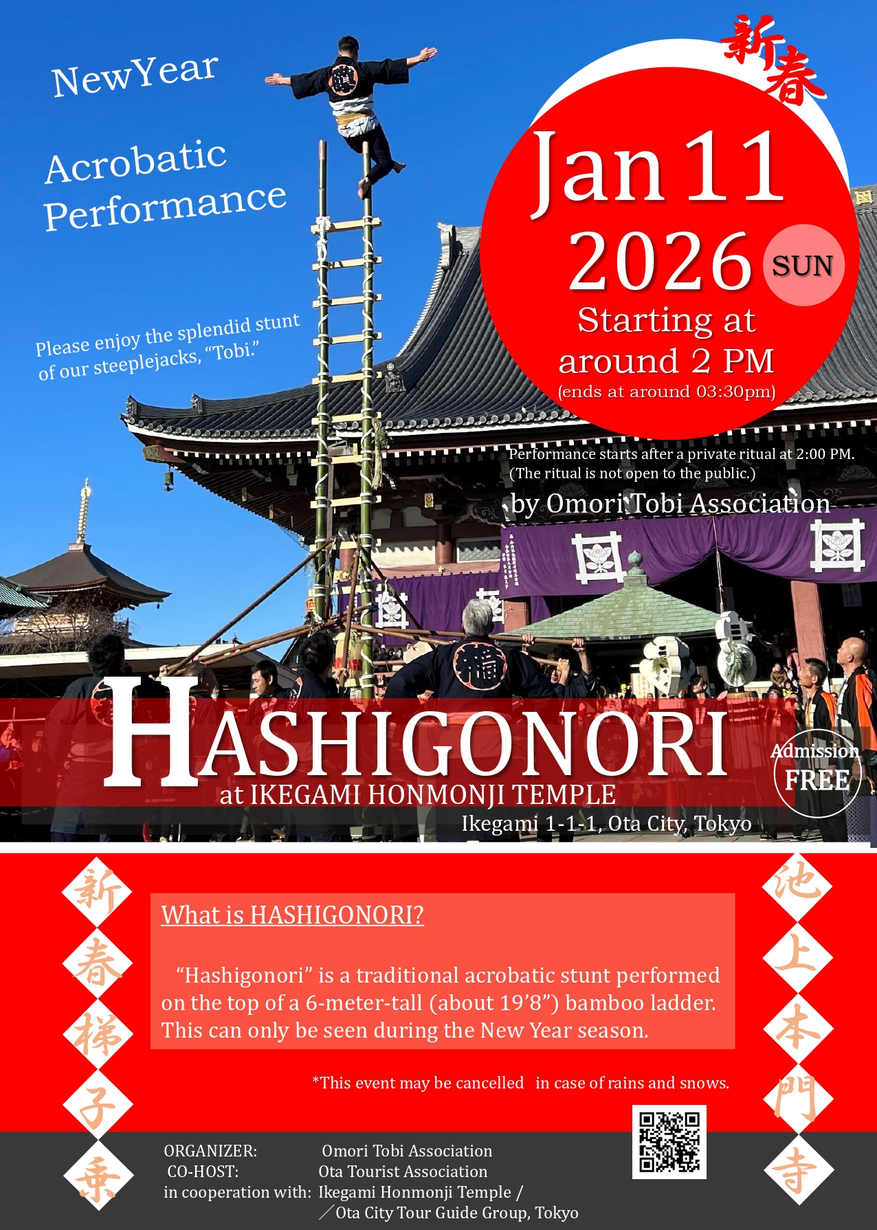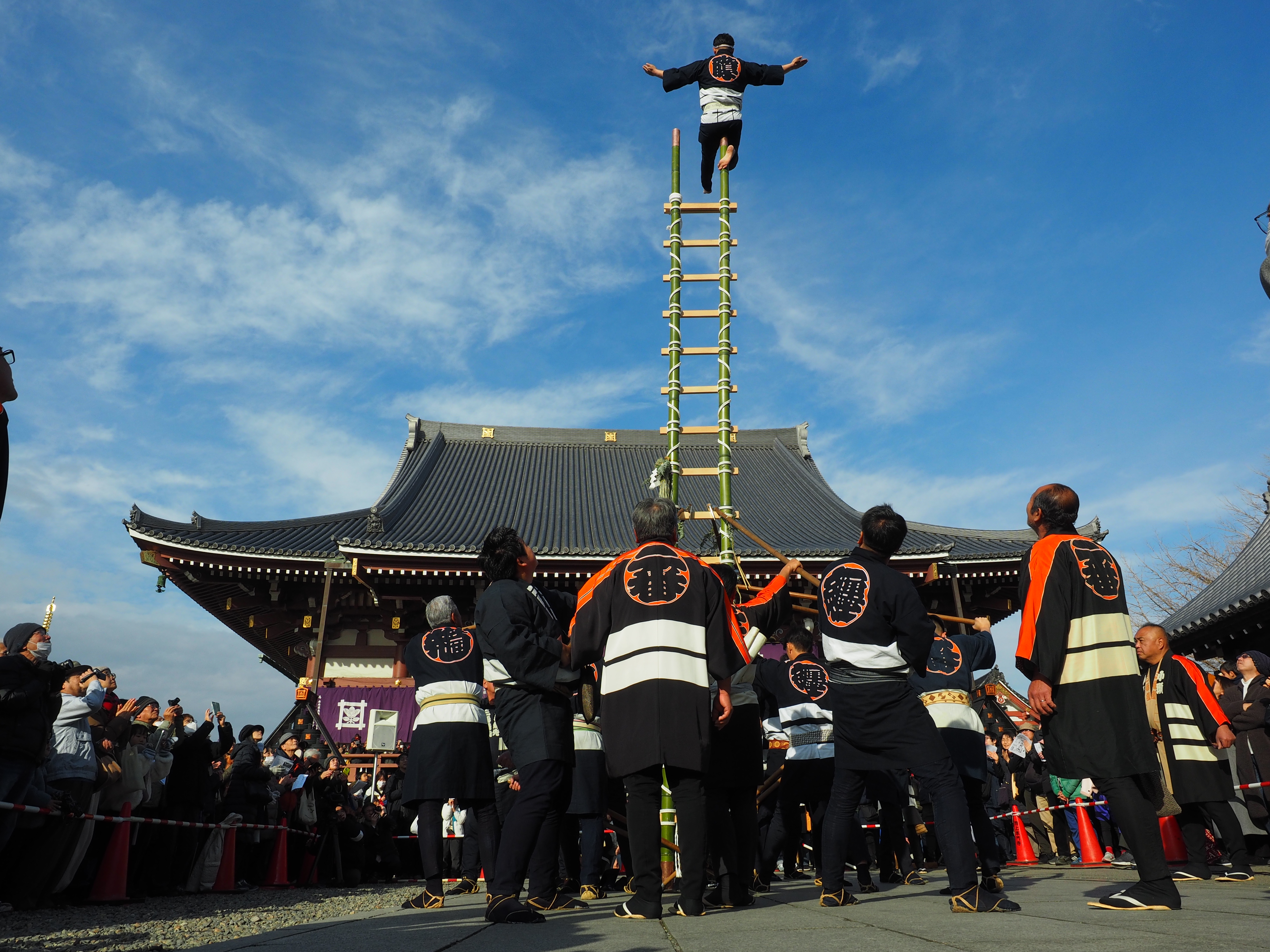 池上本門寺で大森鳶組合による「新春・はしご乗り」の奉納が行われます。