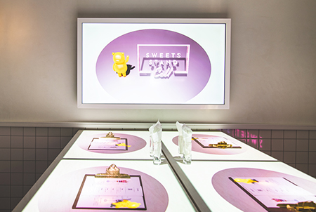予約制のコース来店では、照明を落とした店内にプロジェクションマッピングとデジタルサイネージを展開。コースの流れに合わせて変化する鮮やかな3D映像がメニューを彩り、幻想的な世界に没入できること間違いなし。コースメニューは、パフェとトリュフが香る照り焼きチキンスライダーバーガー、砂糖でできたバブルが載ったドリンクで、お土産のもなかとオリジナルキーホルダーがセットになっています。