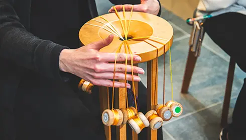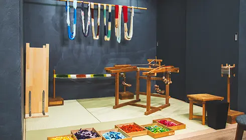組紐体験では、まず組紐の歴史を学び、8世紀から13世紀にかけて作られた美しい組紐の復元作品を鑑賞します。その後、職人が使用するものと同じ素材と道具を使い、実際に組紐作りを体験。講師が一つひとつの作業を丁寧に教えてくれます。組む工程を追うのは、最初は難しいと感じるかもしれません。ですが、繰り返していくうちに、反射的に手が動くようになり、穏やかな瞑想状態のような心地よさを感じるようになります。一回一回の動作で自分の組紐が長くなっていくのを見ていると、充実した気持ちで満たされます。最後には、自分の心の状態を反映したような美しい組紐が出来上がります。