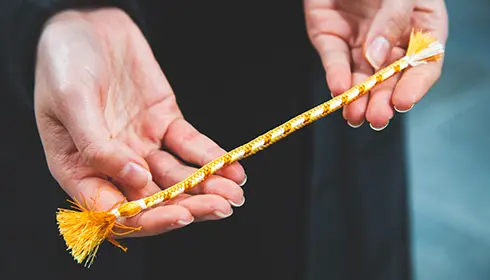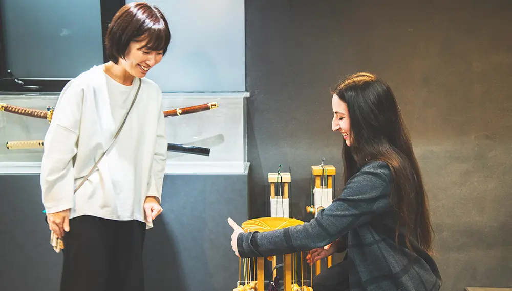 その後は、抹茶とお菓子をいただきながら、講師が組紐をブレスレットやキーホルダー、ストラップに仕立ててくれます。手作りの組紐を見るたびに、この穏やかでやりがいのある体験を思い出すことができるに違いありません。