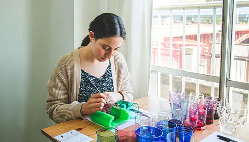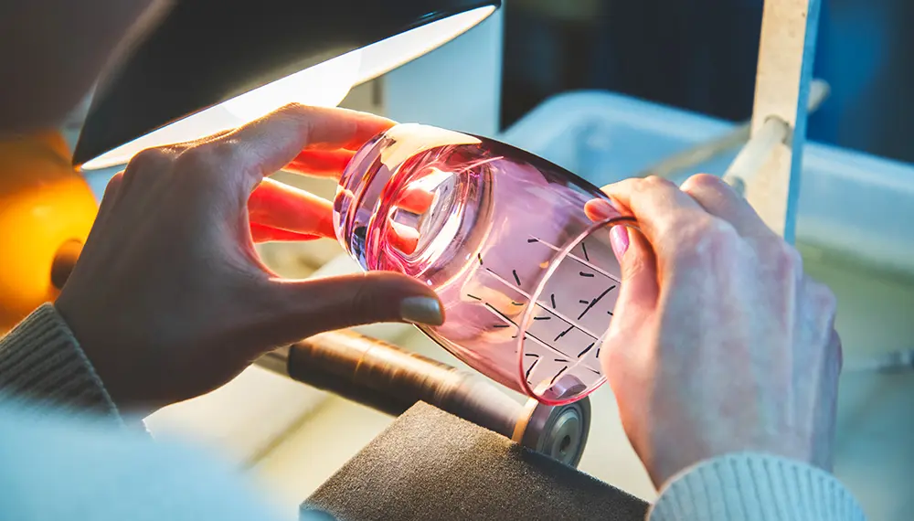 体験では、様々な種類のガラス、色、デザインから選ぶことができ、中でも幾何学模様や自然をテーマにしたデザインが人気です。まずはガラスカットの技術を練習し、その後、オリジナルの切子グラスをデザインします。最初は、ガラスが円筒形の形状のため、デザインを正確に彫刻するのが難しく感じます。しかし、練習を重ねるうちに、切子用の刃を使ってさまざまなユニークな模様を作り出すコツがつかめてきます。江戸切子ならではの技法を通して、自分の思い描いたイメージが形になる瞬間はとてもワクワクするものです。