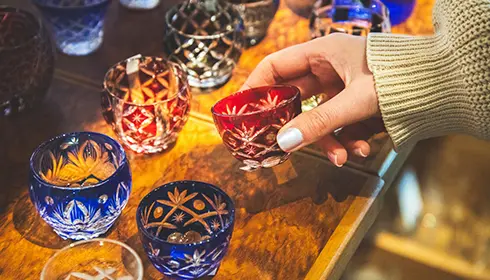 1834年に起源を持つ江戸切子は、洗練された文様で愛される日本の有名なガラス工芸品です。光を浴びれば輝きを放ち、精巧な模様が織りなす色とりどりの影を映します。創吉は1000種のグラスを扱う販売店で、職人と同じ機械や刃物を使った本格的な切子ガラス体験ができます。