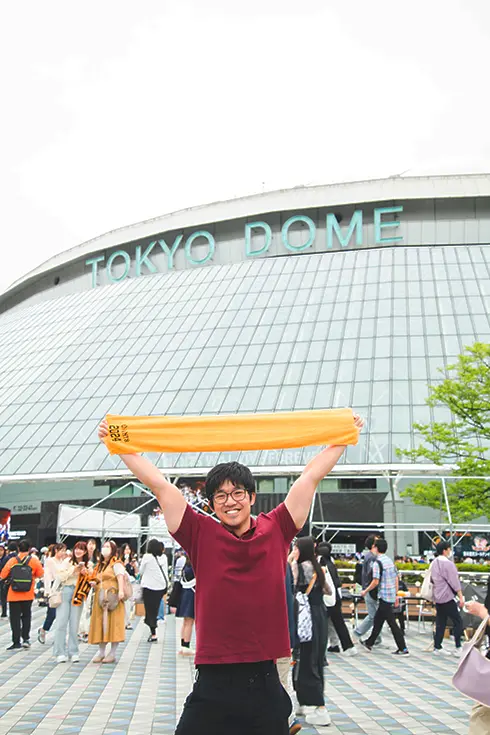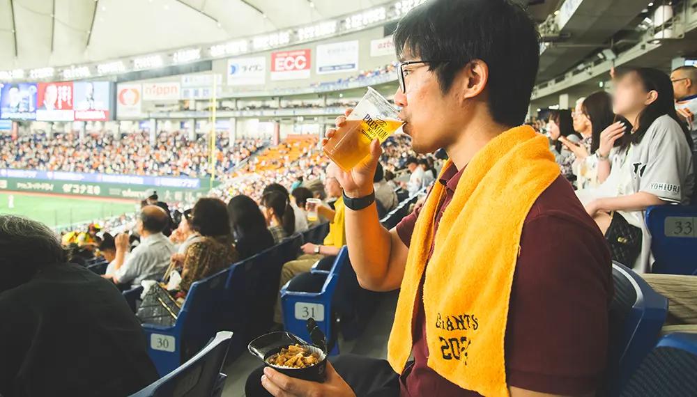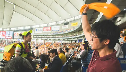 プロ野球観戦では、ファンと一緒に応援に参加するのも楽しみの1つです。よりアクティブに楽しむなら、外野席がおすすめ。一塁側外野席では、読売ジャイアンツの得点時などに応援歌「VIVA GIANTS」を歌いながら、オレンジ色のタオルを頭上で振り回す応援スタイルが定番となっています。