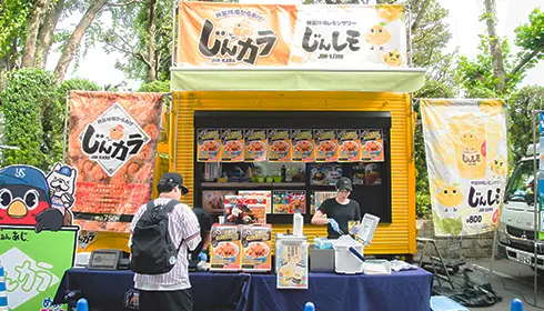 1963年に球場内初の飲食スタンドとしてオープンし、歴代の選手たちに愛された名物カレーがいただける「欅」や、元高校球児で、学生野球の聖地でもある明治神宮野球場を目指していたという店主がこだわりのカレーを提供する「スタジアムカレー」など、球場内にはそれぞれのストーリーを持ついくつかの店舗でオリジナリティあふれるカレーが販売されています。他にも、球場オリジナルからあげ「じんカラ」や球場オリジナルレモンサワー「じんレモ」など、ここならではの人気グルメが揃うので、ぜひいろいろ試してみてください。