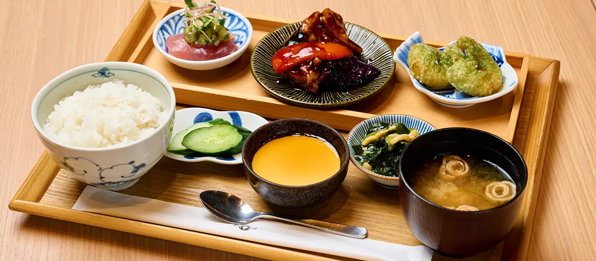 メニューは炊きたてのご飯を主役に据え、ご飯との相性が絶妙なバランスになるよう、あっさりとした味付けが特徴です。ご飯のおかわりは何杯でも無料なので、おなかいっぱいになるまで食べることができます。季節の料理は日替わりで提供され、豚の角煮は特に人気です。「丁寧に作られた定食のシンプルな喜びを気軽に体験してほしい」と店主は語ります。