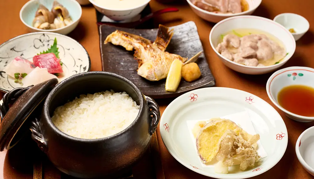 年間を通して約30種類を厳選し、常時5種類の銘柄米を提供。いずれも同一の手法で炊き上げるため、品種ごとの繊細な違いを正確に比較できます。メニューはコースに加えてアラカルトも用意。季節の焼き魚やすき焼き、定番の味噌汁などがお米を引き立てます。