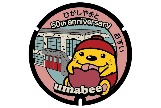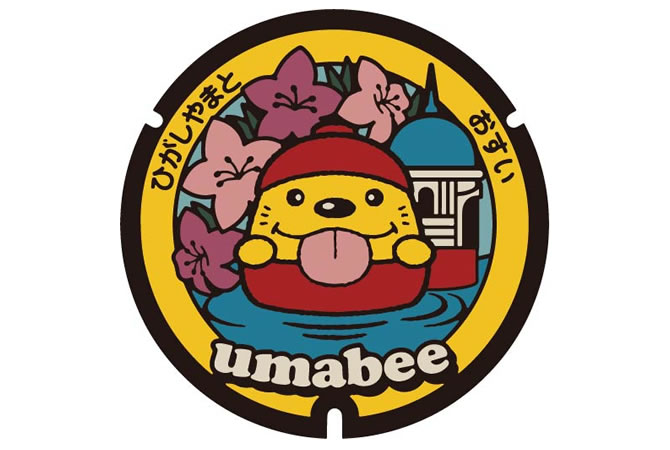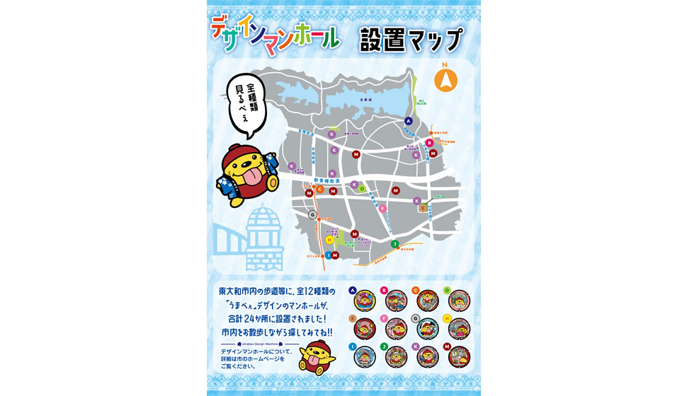 東大和市では、市観光キャラクター「うまべぇ」を中心に、市のシンボル「多摩湖」をはじめとした豊かな自然や、史跡、モニュメント等の魅力あふれるスポットをテーマとした12種類の図柄のデザインマンホールを作製しています。