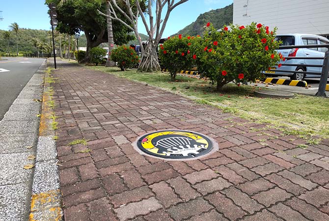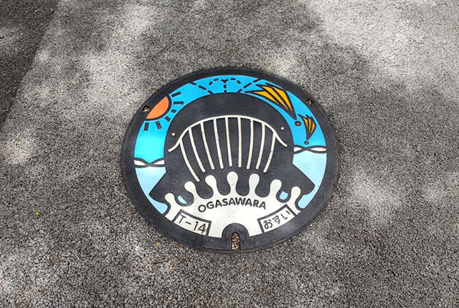 2016年にオリジナルマンホールデザインのコンテストを開催。全63点の力作ぞろいの作品の中から選ばれた、青空をバックに小笠原の海で遊ぶザトウクジラのふたが2017年からお目見えしてます。2021年にはサンセットの中でのホエールウォッチングをイメージした色違いバージョンも登場です。ボニンブルーの海の上だけでなく、陸上でもイルカやクジラに出会うことができ、ホエールウォッチング気分で探せます。