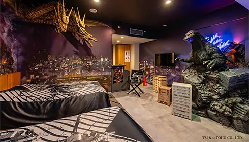 「ゴジラVSキングギドラルーム」は、ゴジラ映画の特撮スタジオを訪れたような臨場感たっぷりの室内で監督気分を味わえる新コンセプトルームです。ほかにも、窓の外に迫るゴジラの姿を間近に感じられる「ゴジラビュールーム」や、巨大な“ゴジラの手”が部屋を覆い、様々な演出でゴジラの臨場感を体感できる「ゴジラルーム」などがあります。宿泊者には、限定のテーマグッズも用意されています。