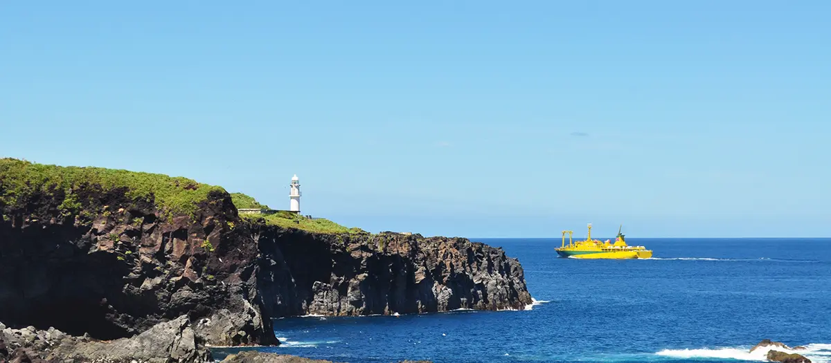 三宅島の東に位置する「サタドー岬」は、海面から20メートルの高さの絶壁にそびえるビュースポットです。海に突き出た形が特徴のこの岬は、海に流れ込んだ溶岩が波の浸食を受けて形成されたと考えられています。黒い柱状節理と赤い火山弾、スパター(溶岩餅)に囲まれてそびえたつ灯台からは広大な海の眺めを堪能できます。