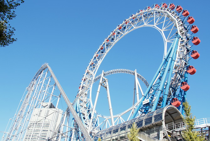 東京ドームシティ アトラクションへの入園は無料で、思う存分遊園地を満喫できます。遊園地の醍醐味を体験できるサンダードルフィンからスタートしましょう。中心が空洞になっている観覧車・ビッグ・オーの間や建物の間を、波のようにすり抜けます。ビッグ・オーも大人気のアトラクションで、15分間の乗車中、景色を眺めたり、ゴンドラ内に設置されたカラオケを楽しむこともできます。