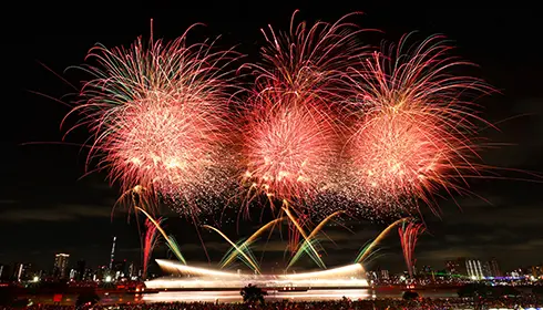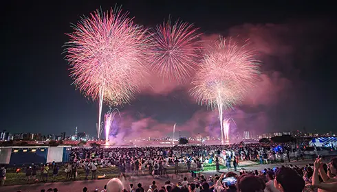 東京の大規模花火のトップをきって開催する「足立の花火」。2025年は例年と異なり5月の開催となります。見どころは、約14,000発を1時間で打上げる高密度に凝縮された迫力ある花火です。Wナイアガラやレーザーを使った演出なども実施します。さらに今年は千住宿開宿400年を記念して、例年の13,000発と千住にちなんだ1010(せんじゅ)発を合わせた総数14,010発の花火が打ちあがります。記念の仕掛け花火の演出もぜひお楽しみください。