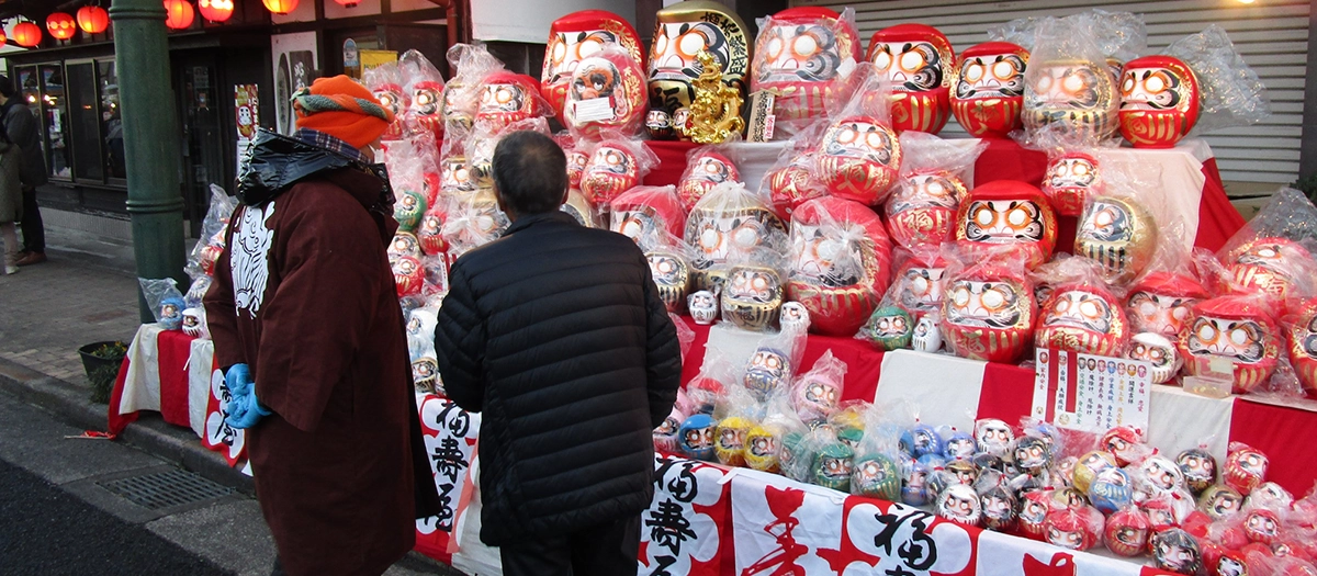 だるま市の当日は、旧青梅街道が歩行者天国になります。多くの露店がだるまを販売し、地元住民だけでなく日本各地からの訪問者で賑わいます。