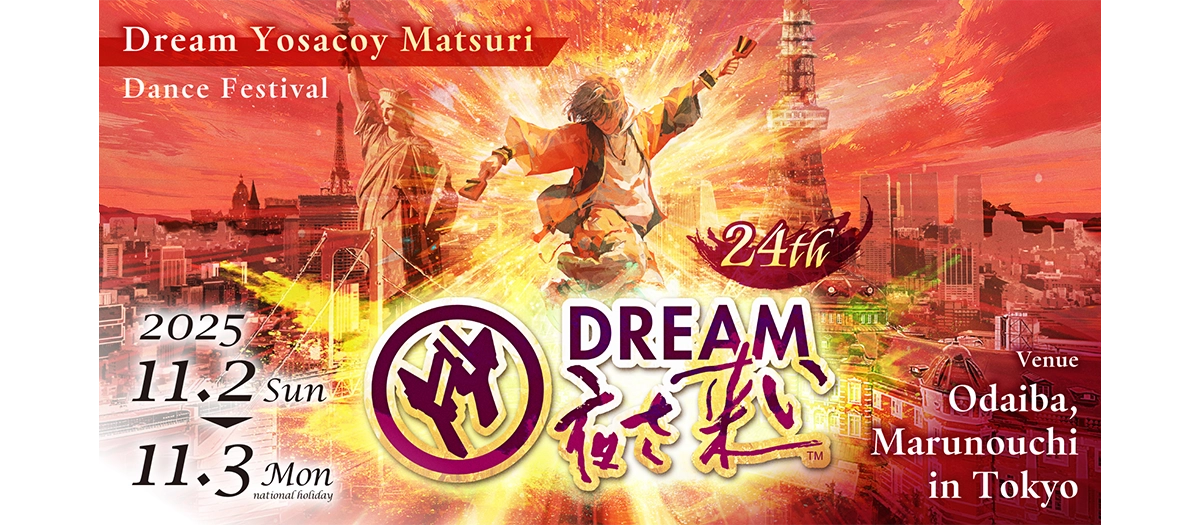 「ドリーム夜さ来い祭り」は、全国から約5,000人の踊り子が集結する東京最大規模のお祭りです。この祭りでは、日本の伝統文化をルーツにもつ鳴子を使用する踊りのスタイルである「よさこい」が披露されます。今回は、「お台場 自由の女神会場 ナイトタイム特別企画」として「お台場 Dreamプロジェクションマッピング featuring 第24回ドリーム夜さ来い祭り」でのよさこい演舞等とのコラボレーションや、史上初の歌舞伎×アニメ×祭りをテーマにした屋外ホログラムショーの実施・どなたでも無料で飛び入り参加可能な正調よさこい鳴子踊り講習会&演舞体験などのイベントが行われます。丸の内会場ではYouTubeライブ配信も実施されます。お台場 自由の女神会場では、無料観覧のほか、有料桟敷席・観覧席も用意されています。