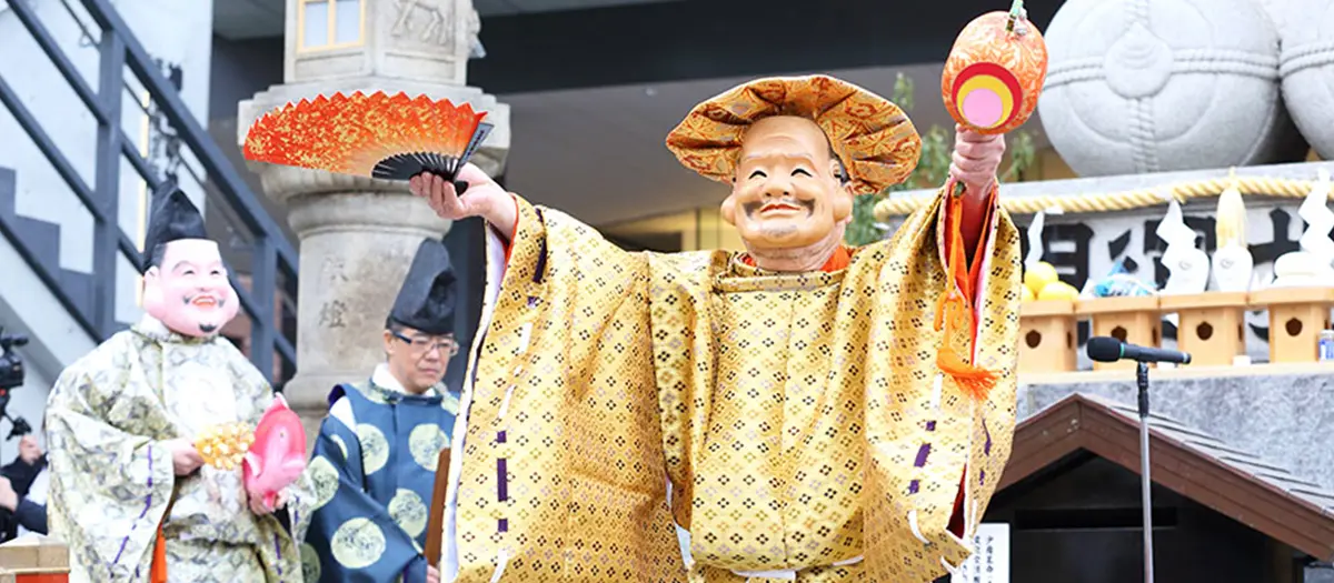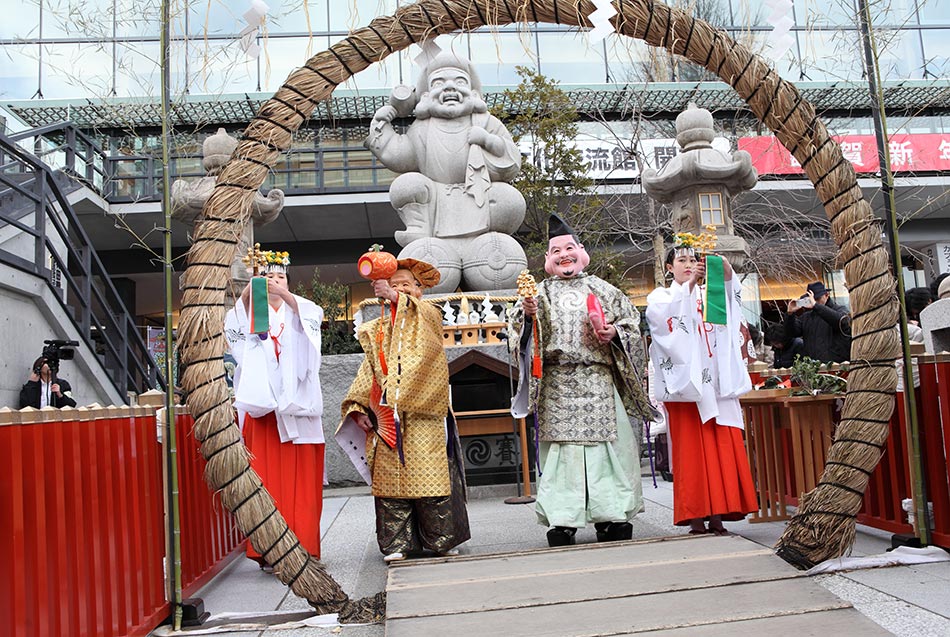 家庭円満、縁結び、商売繁盛、事業繁栄のご利益で、毎年、全国からの参拝者でにぎわう神田明神の初詣。縁結びとは男女の仲を結ぶことだけでなく、すべてのものが幸福であるようにと、互いの発展のための繋がりを結ぶことを意味しています。だいこく祭では、だいこく様に扮した踊り手が幸運の槌で参列者に福をお授けいたします。