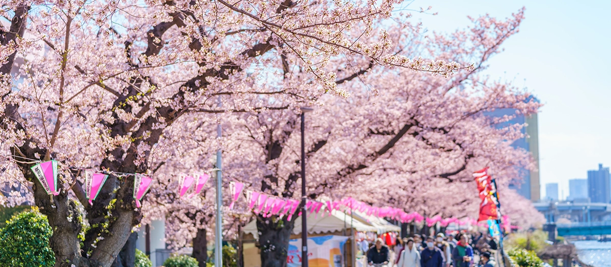 隅田川の河岸は、江戸時代(1603–1867)から桜の名所として有名でした。この祭りは台東区側の隅田公園で開催され、ソメイヨシノやオオシマザクラを含む510本の桜の木があります。川沿いを歩きながら、東京スカイツリー®を背景に咲き誇る美しい桜の景色を楽しむことができます。他にも、伝統的な屋形船や東京水上バスに乗って川を下り、桜の全景をパノラマで眺めることもできます。日が暮れた後も祭りは続き、桜の木々はライトアップされ、夜桜(夜間の桜鑑賞)を楽しむこともできます。