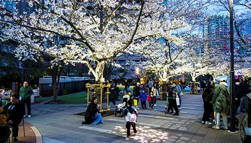 3月19日(木)から4月12日(日)まで、目黒川沿いの親水空間「品川区立五反田ふれあい水辺広場」で「目黒川さくらのライトアップ2026 ~五反田YOZAKURA~」が開催されます。公園内の人工芝エリアや水辺の広場でゆっくりとライトアップを鑑賞することができるほか、目黒川に面した桜には1日3回カラーライトアップの演出も行われます(18:00、19:00、20:00/各回10分程度)。また、目黒川を航行するクルーズ船からも桜を眺めることができ、特別感のある船上での花見を楽しむことができます。五反田のビルの谷間にある癒しの空間で夜桜を堪能しましょう。