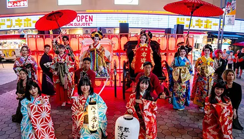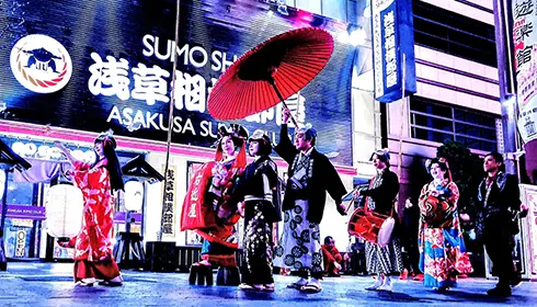 浅草六区ブロードウェイを会場に、毎週金曜、土曜、日曜に開催されているナイトタイムイベント「浅草夜祭」。光、音楽、食、お酒、芸のすべてを楽しむことができる浅草の夜が、さらにパワーアップします。浅草夜祭の開催に合わせて「大衆芸能の聖地・浅草-NIGHT SHOW-」と題し、和楽器演奏と和のノンバーバルパフォーマーによる無料のエンターテインメントショーを実施。また、月1回程度、特別版のNIGHT SHOW「大衆芸能の聖地・浅草-SPECIAL NIGHT SHOW-」も開催されます。