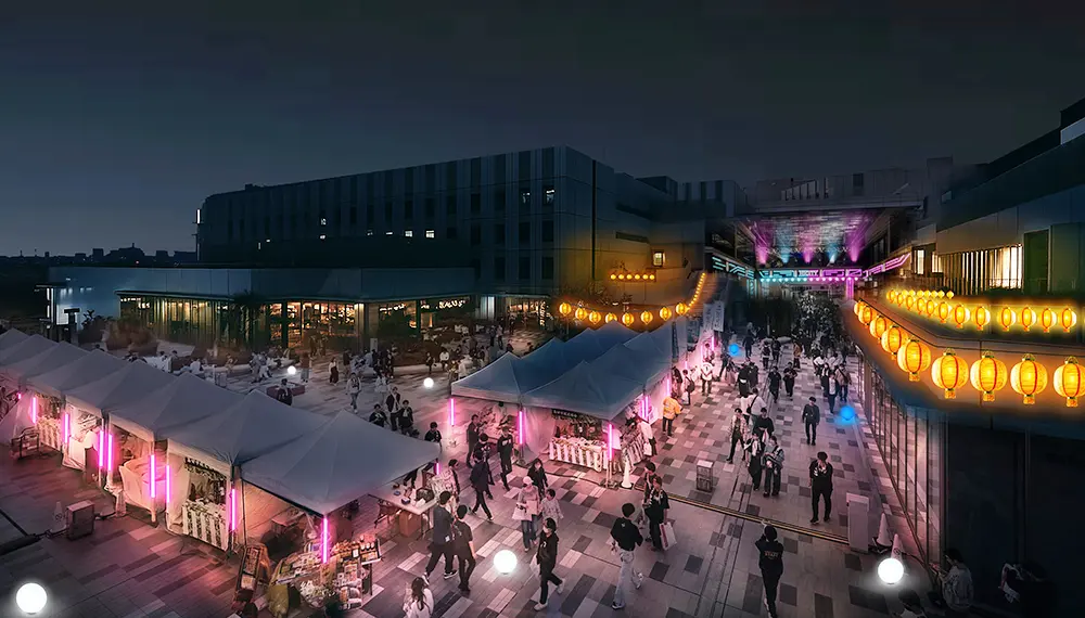 提灯などが創る伝統的な和装飾と、ネオン風ライティングによるサイバーパンク装飾が混在する施設装飾の中で、ラーメンや餃子をはじめとした様々な日本のグルメを日本酒と共に楽しめる大規模イベントです。無料でゲームが楽しめるゲーセンコーナーやアニソン、シティポップをDJがお届けする足湯DJエリアを常設するほか、ライブ時代劇や獅子舞のゲリラ開催も。