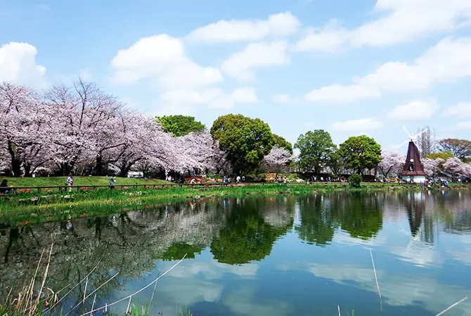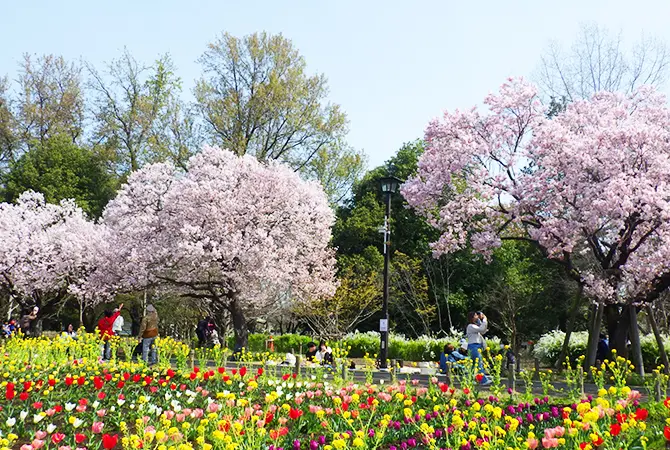 小金井公園には、約50種類、1,400本の桜の木があります。たてもの園そばの広場にあるソメイヨシノは見逃せません。