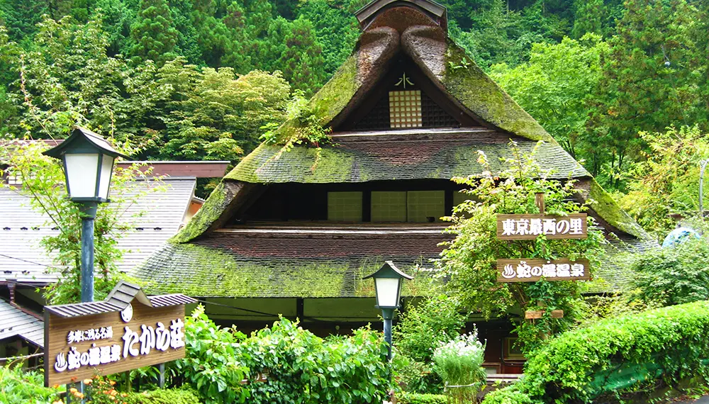 旅の締めくくりは、東京の秘湯として知られる山あいの温泉で疲れを癒しましょう。「蛇の湯温泉たから荘」は300年以上の歴史を持つ日本家屋で、武士の兜を思わせる大きな屋根が印象的です。温泉の歴史も古く、傷を負った大蛇がこの湯で癒されたことから「蛇の湯」と名付けられたと言われています。宿泊しなくても日帰り入浴も可能なので、旅の終わりに立ち寄りやすいのも魅力です。すぐそばを流れる川のせせらぎを聞きながら、里山文化と温泉の温もりをゆったり感じられる、まさに癒しのスポットです。