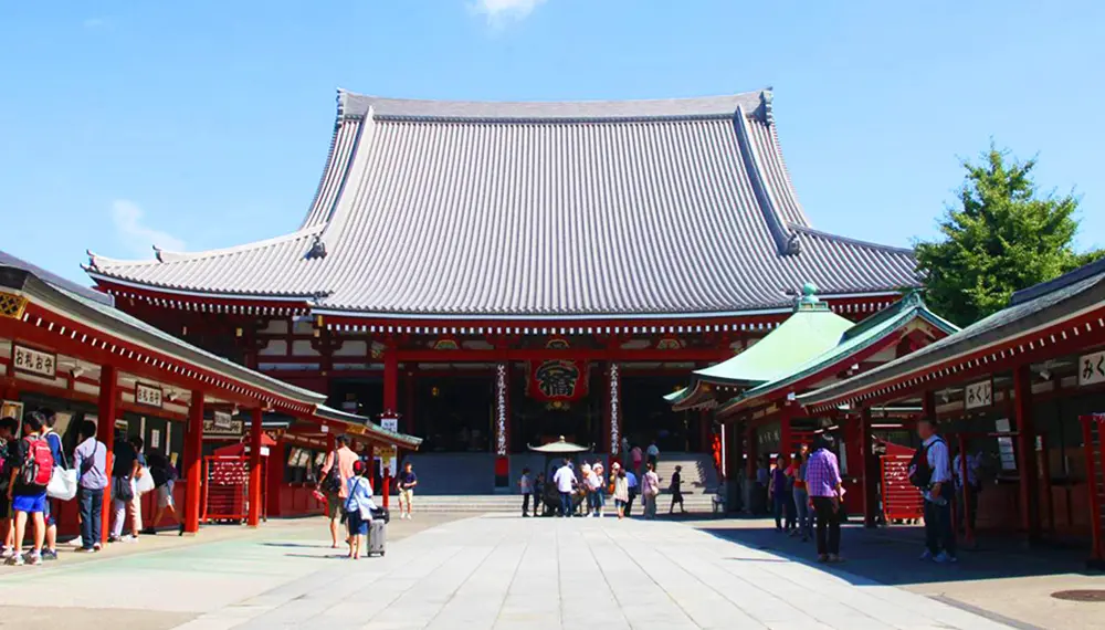 浅草寺は、東京を代表する観光地、浅草を代表する東京最古のお寺です。入口には赤い大提灯が目印の「雷門」があり、その先には江戸時代からの歴史がある商店街「仲見世」があります。仲見世では人形焼などの名物を食べたり、さまざまなお土産を買うことができます。