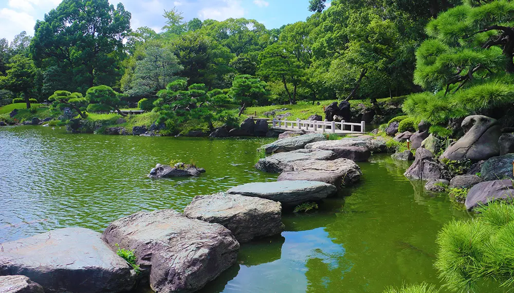 清澄庭園はどの季節に訪れても美しい芝生と青々とした郡葉があり、フォトジェニックな池には鴨、鯉、亀などが住みついています。池の端には飛び石が置かれ、曲がりくねった小道が様々な様相を表しています。木々や花々、木製の東屋は、写真の背景としても魅力的です。また、庭園の奥には、松尾芭蕉の最も有名な句「古池や かはづ飛び込む 水の音」の句碑があります。芭蕉にインスピレーションを与えたこの静穏を感じたいなら、ぜひ朝のうちに庭園を訪れてみましょう。
