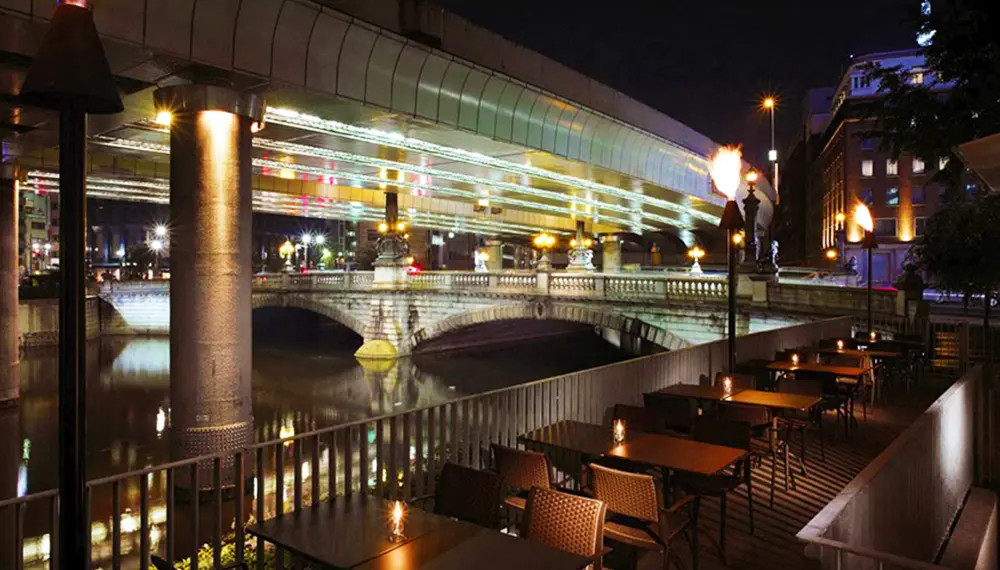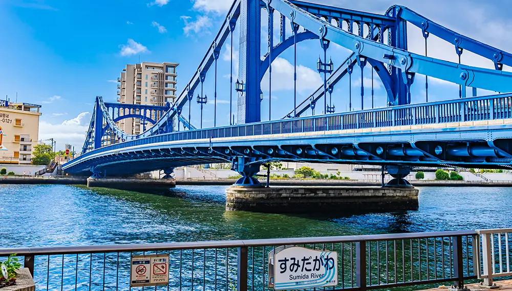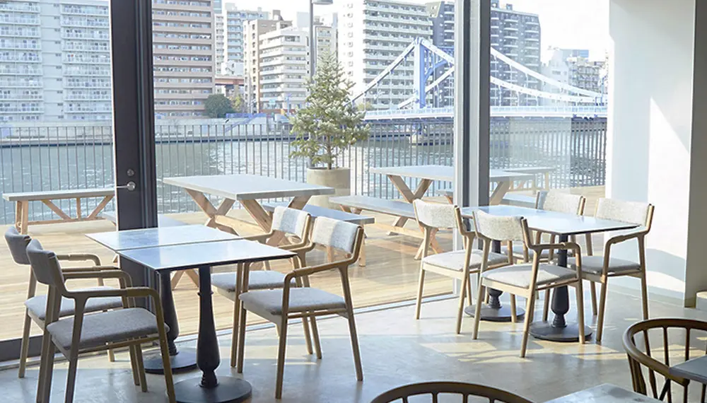 清澄庭園から10分ほど歩くと、隅田川に架かる力強い存在感を放つ「清洲橋」にたどり着きます。1928年に竣工されたこの橋は、ドイツのケルンにある橋をモデルとしています。階段を上がって左手に少し歩き、橋と川の景観とランチが楽しめる水辺のレストランを目指しましょう。