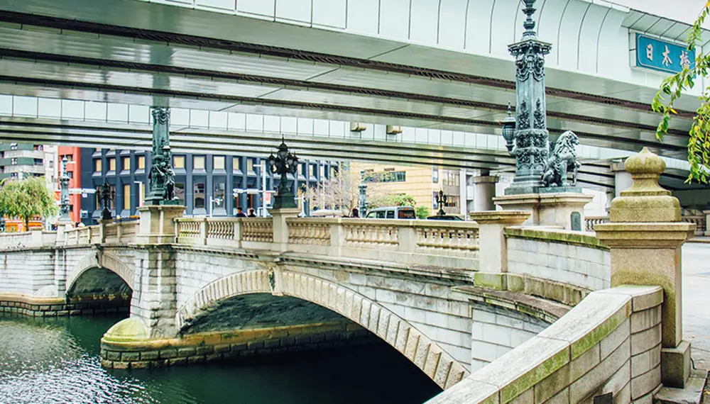 日本最古の地下鉄、銀座線に乗って日本橋へ。浅草から約15分で到着します。名橋・日本橋のたもとには「道路元標」の銘があり、この橋が何世紀にもわたって日本各地への起点を担っていることが分かります。