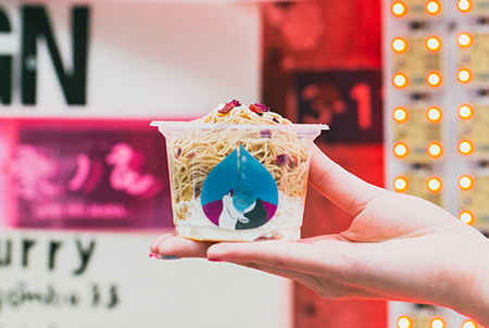 신주쿠 가부키초의 ‘닌겐 레스토랑’ 안에 있는 몽블랑 푸딩 전문점 ‘구리노하나’의 명물은 니가타에서 탄생한 인기 스위트 ‘몽블랑 푸딩’을 화려하게 재해석한 일품입니다. 한입 먹으면 확실한 맛이 입 전체로 퍼집니다. 니가타 쓰바메 산조에서 만든 특별주문 금형으로 짜낸 1mm의 지극히 얇은 밤 페이스트가 밤 본래의 은은한 단맛을 살리면서 사르르 녹는 식감을 자랑합니다. 일반적인 몽블랑 스펀지 반죽과는 달리 밤의 맛을 더욱 돋보이게 하는 숨은 비밀병기가 있습니다. 바로 구운 푸딩입니다. 고소하게 살짝 그을린 캐러멜의 단맛이 크게 자기주장을 하지 않는 가운데 푸딩의 촉감도 밤 페이스트와 거의 같습니다. 따뜻한 물을 부으면 꽃이 피는 공예차와 함께 드셔보세요. 화려함의 극치를 즐길 수 있습니다. 세계적인 영화상을 수상한 일본 애니메이션 작가 겸 일러스트레이터 가부키 사와코 씨가 디자인한 로고도 매력 포인트 중 하나입니다. 런천 매트와 테이크아웃용 컵에 세련된 일러스트가 그려져 있습니다.