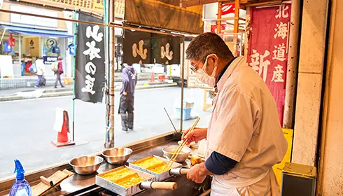 일본요리의 중심은 신선한 생선입니다. 도쿄에는 유명한 어시장이 여러 곳 있으며, 아침 일찍부터 영업하고 있습니다. 세계 최대 어시장 중 하나인 도요스 시장에서 다랑어 경매 현장을 견학한 뒤 가까운 레스토랑에서 신선한 초밥이나 회로 아침식사를 즐기시기 바랍니다.