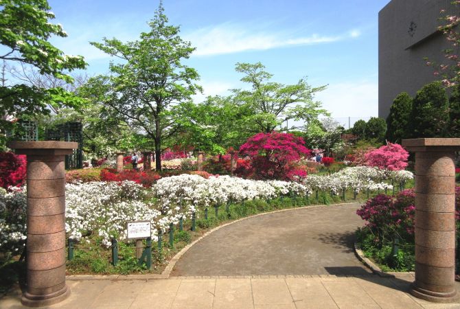 철쭉으로 유명한 네리마역 근처의 잘 손질된 녹지공간 헤이세이 철쭉공원에서 산책을 즐겨 보십시오. 4월 하순에는 연산홍이 만발합니다.