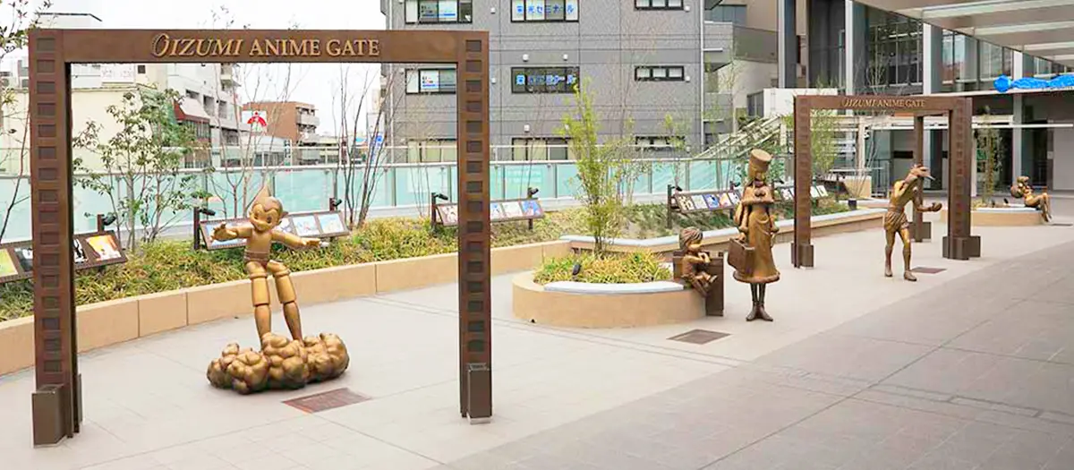 오이즈미 아니메게이트는 2015년 4월에 ‘애니메이션 1번지 네리마구’를 상징하는 신명소로서 오이즈미가쿠엔역 북쪽 출구 보행자 전용 데크에서 문을 열었습니다. 일본 애니메이션의 발상지인 오이즈미의 현관문으로서 네리마구와 인연이 깊은 실물 사이즈 캐릭터들이 손님을 맞이합니다. “우주소년 아톰”의 아톰, “내일의 죠”의 야부키 죠, “은하철도 999”의 호시노 데쓰로와 메텔, “시끌별 녀석들”의 라무 브론즈상을 비롯해 ‘네리마 애니메이션 연표’와 ‘그래픽 월’ 등을 통해 네리마의 애니메이션을 체감할 수 있습니다.