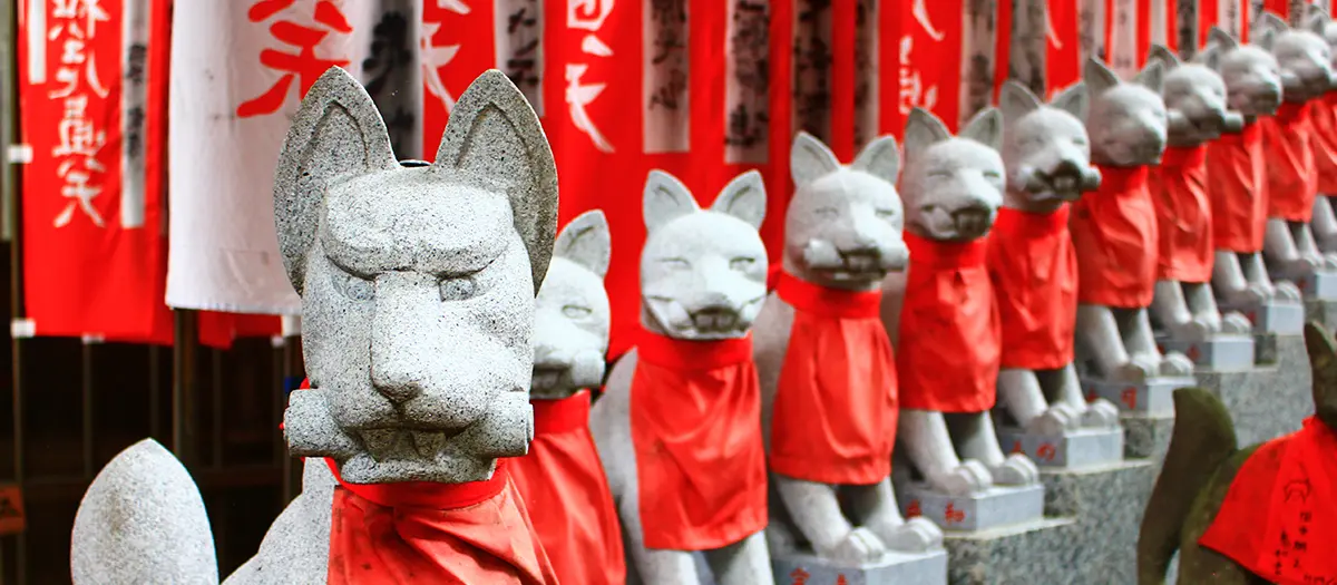긴 도자기 벽을 따라 장식된 아름다운 붉은 연등이 늘어서 있는 유서 깊은 도요카와이나리 사원 도쿄 별원에서는 도쿄의 역사가 깃든 영적인 힘을 체감할 수 있습니다. 이 사원은 수백개의 여우 조각상이 있는 것으로 유명합니다. 이것은 곡식 신 이나리사마라고 불리며, 일본의 신도에서는 신(의 사자)으로 모시고 있습니다. 또한 사원 경내에서는 개구리 조각상과 펄럭이는 수천개의 붉은 깃발을 볼 수 있습니다.