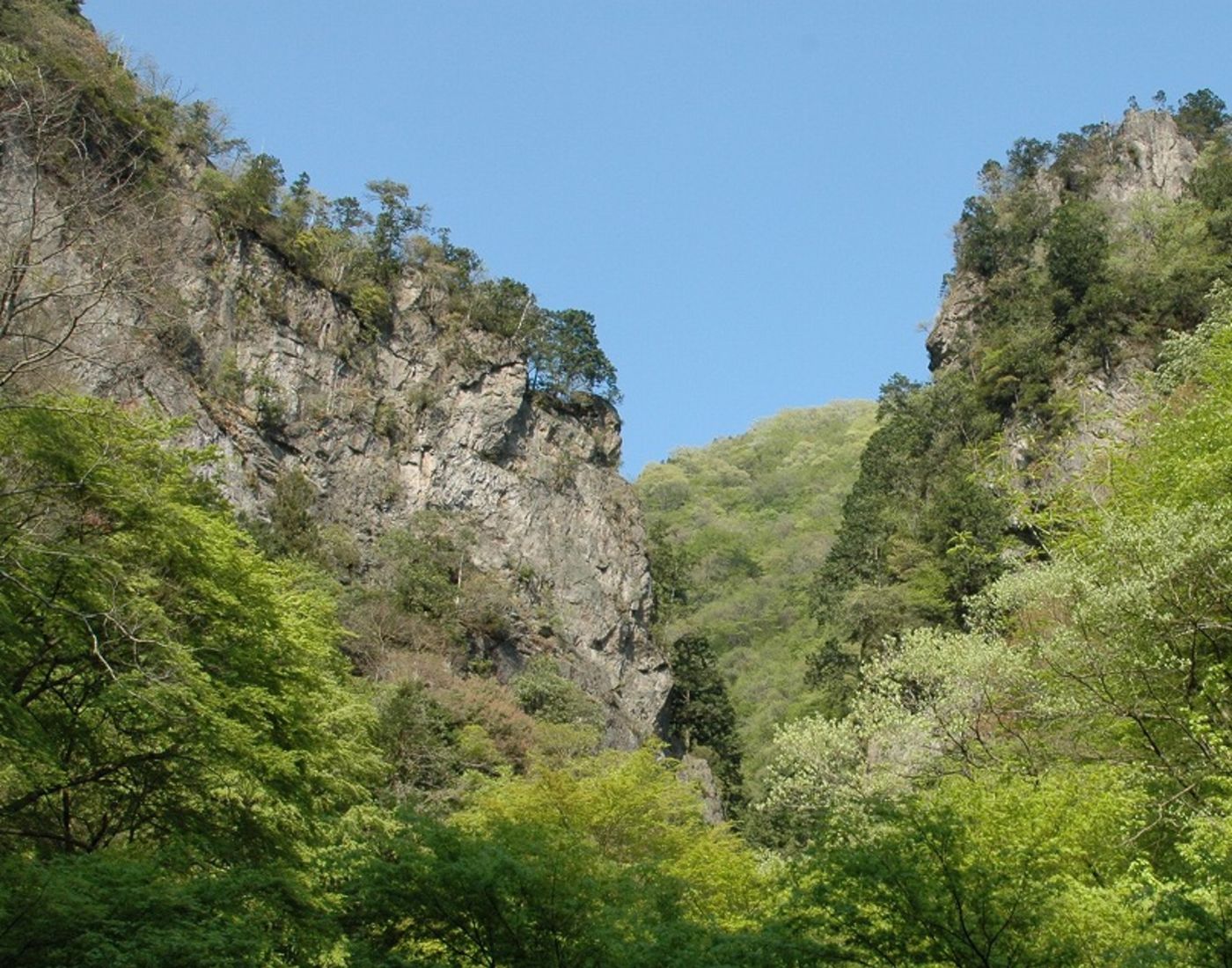 가노토이와는 총 길이 60미터의 협곡으로 절벽이 자연 비석 같습니다. 고정된 체인과 다리가 있는 좁은 길을 걸어서 협곡을 따라 있는 폭포를 둘러볼 수 있습니다. 이 길은 딱히 걷기 어렵지 않으니 걱정하지 마세요. 아래를 흐르는 강이 깎아내린 약 100미터 높이의 울퉁불퉁한 석회석 암반을 올라가는 록 클라이머가 있을 때도 있습니다. 히노하라무라역에서 버스로 40분 걸려서 길의 입구에 도착합니다.