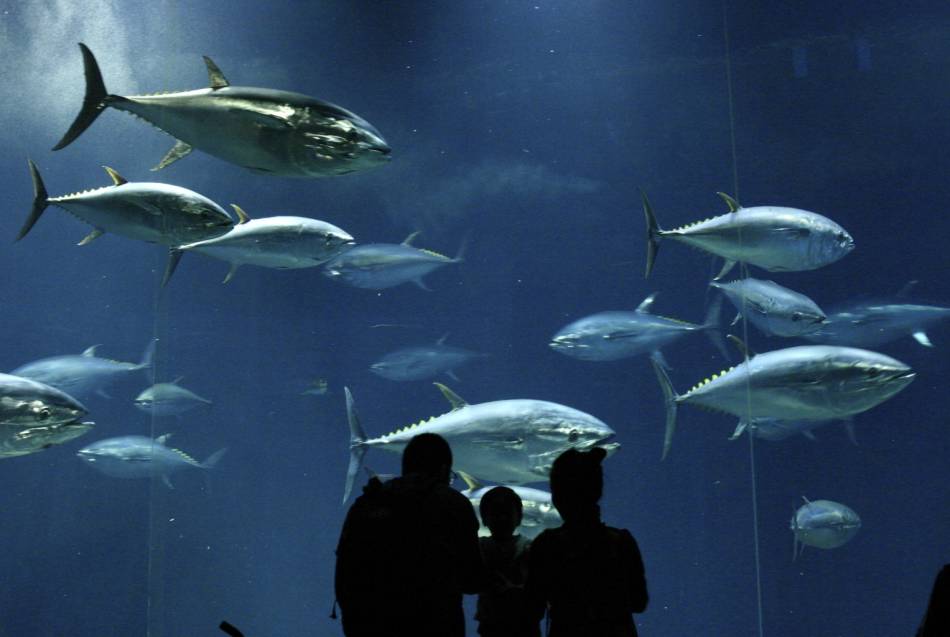 - 수족관의 인기 명소인 2,200톤의 거대한 수조를 참다랑어가 빠른 속도로 무리지어 헤엄치고 있습니다.
