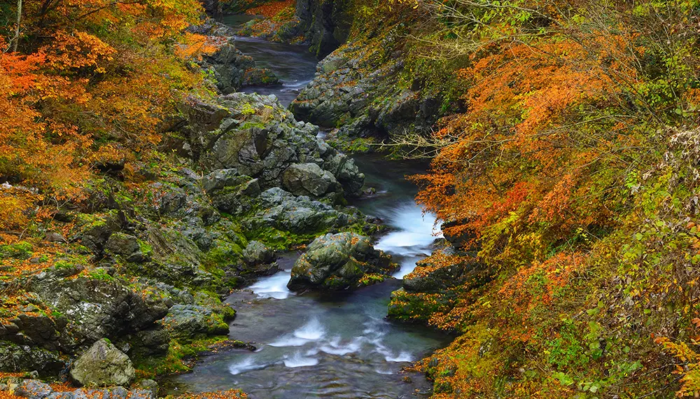 아키가와는 '가을의 강'이라는 이름에 걸맞게 신선한 신록에 뒤덮여 있던 계곡이 가을에는 불타는 듯한 붉은 단풍, 황금색 은행 등 다른 색조의 오렌지빛으로 둘러싸입니다. 단풍을 즐길 최적의 장소는 현수교인 세이슈바시입니다.