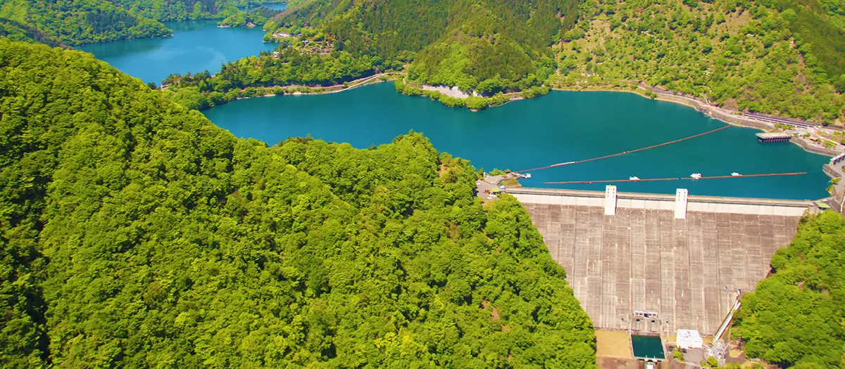 일본 최대급의 수도 전용 저수지인 오고우치 댐은 총 저수량이 약 1억 8천 5백만 톤이며, 도쿄 주민들에게 물을 공급하고 있습니다. 보 높이 149미터, 길이 353미터의 이 댐은 19년에 걸친 공사로 완성되었습니다.