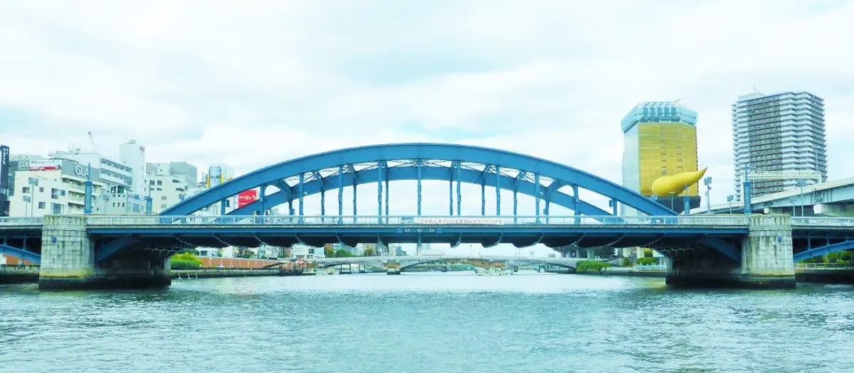 이 푸른색 아르 데코 스타일의 다리는 1927년에 준공하여 스미다가와 강에 설치되었습니다. 한가운데의 난간에서 도쿄 스카이트리가 또렷하게 보입니다. 멈춰서서 사진 찍는 것을 잊지 마세요.