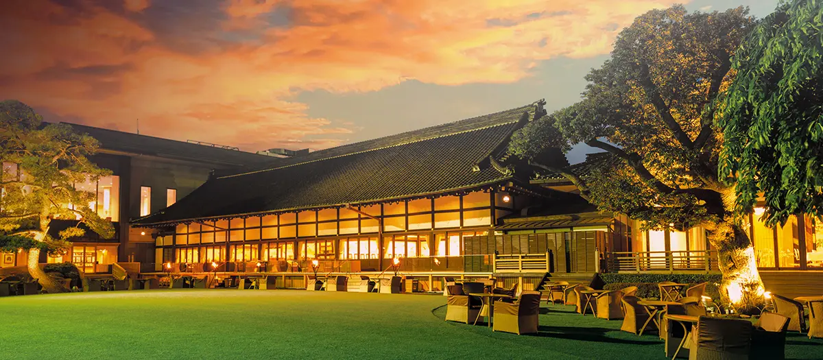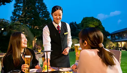 ‘메이지 기념관’ 안에 있는 정원의 비어 테라스. 주변에 높은 건물이 적어 넓은 하늘을 바라볼 수 있기 때문에 도심 한가운데에 있다는 사실을 잊게 됩니다. 메이지 기념관의 결혼식 요리를 담당하고 있는 셰프가 제공해 드리는 본격적인 요리와 차가운 맥주를 즐길 수 있습니다. 화톳불 조명을 받은 정원에서 일상을 떠난 색다른 시간을 보낼 수 있습니다.
