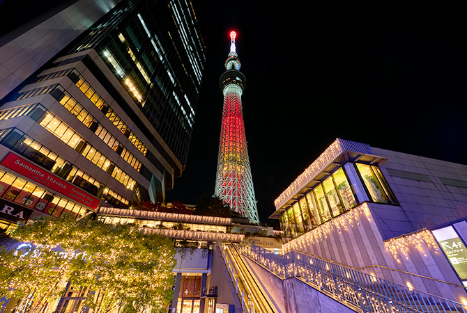 크리스마스 한정 라이팅으로 도쿄 스카이트리를 크리스마스 트리처럼 보이도록 연출하는 ‘샴페인 트리’와 양초처럼 보이도록 연출하는 ‘캔들 트리’ 등 두 종류의 연출로 크리스마스를 표현해 환상적인 빛으로 둘러싸인 타워의 거리로 변모합니다.