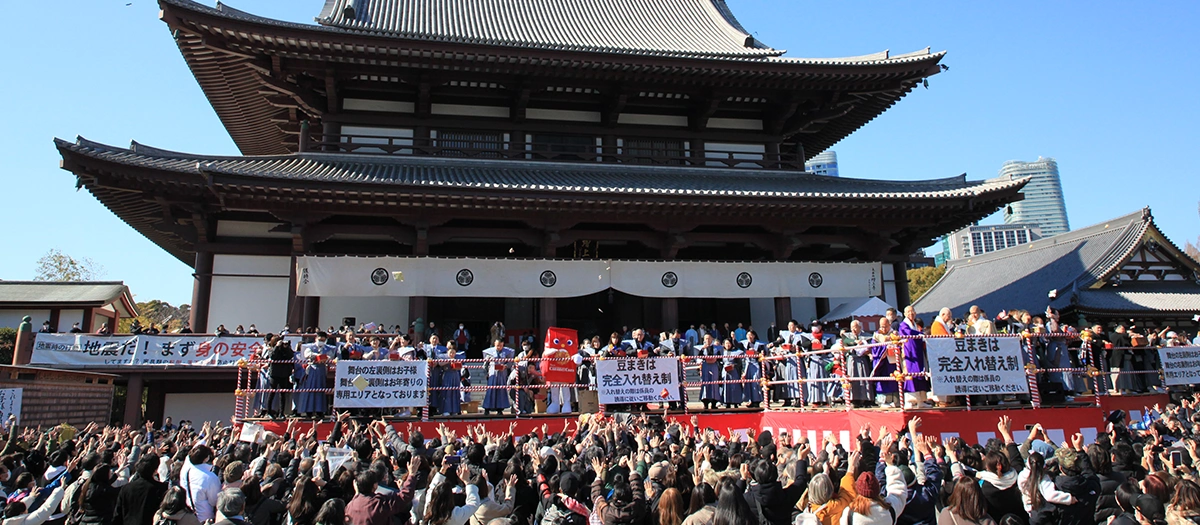 조조지 절의 의식은 국가의 중요문화재 삼해탈문을 배경으로 절 주변을 행진하는 ‘신지 퍼레이드’로 시작합니다. 퍼레이드는 그 해와 같은 띠의 남녀가 일본의 전통의상인 가미시모를 입고 행렬을 선도합니다. 이어서 손으로 직접 만든 화려한 가미시모를 입은 유치원 아이들이 그 뒤를 따르며 경내를 화려한 색으로 물들입니다. 특설무대에서는 떡메 치기가 진행되고, 미취학 아동이 콩을 뿌려 귀신을 쫓는 ‘오니몬도’ 의식이 열립니다. 최대 행사인 마메마키(콩뿌리기) 때는 스모 선수들, 스모 지도자, 스포츠 선수, 연예인 등의 저명인사들이 등장합니다.