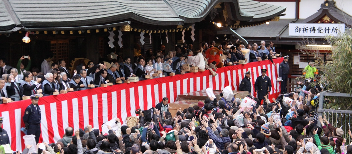 축제는 오후 내내 진행됩니다. 콩뿌리기 의식 때는 한 해의 행운을 기원하며 참가자 전원이 “복은 안”이라는 구호를 외칩니다. 또한 신사까지의 참배길에는 콩을 뿌리는 사람들의 행렬도 볼 수 있습니다.