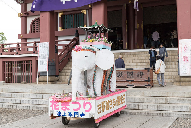 이케가미 혼몬지 절에는 간토 지방에서 가장 오래된 오층탑이 있습니다. 이 탑은 국가의 중요문화재로 지정되어 있으며, 1년에 한 번 특별개장이 이루어집니다. 축제 기간에는 부처님의 탄생을 상징하는 음료인 수국차를 맛볼 수 있습니다.