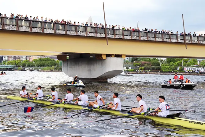 1905년 이래 매년 봄이 오면 일본의 명문대학인 와세다 대학과 게이오기주쿠 대학의 보트부가 스미다가와 강에서 한판 승부를 펼칩니다. 이제 이 레갓타는 100년 이상의 역사를 자랑하고 있으며, 현재는 일련의 보트 레이스가 펼쳐지고 있습니다. 메인 레이스에서는 9명의 선수들로 구성된 팀이 3,750미터 앞의 골라인을 향해 한 몸이 되어 노를 저어 나아갑니다. 또한 양 대학 응원단의 화려한 응원도 볼거리 중 하나입니다.