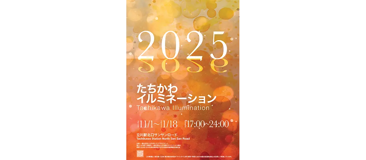 ‘2025 다치카와 일루미네이션’은 반짝이는 빛에 휩싸여 다치카와의 겨울을 즐기는 참가형 이벤트입니다. 메인 회장인 산산 로드는 다치카와역 북쪽 출구에서 이어지는 보행자 전용 도로로, 시민 모두에게서 사랑받고 있는 다치카와의 상징적인 명소입니다. 기간 중에는 현지 학생들에 의한 취주악 연주와 마켓 이벤트가 개최되어 흥겨운 분위기에 휩싸입니다. 또한 미도리초 공원에도 일루미네이션과 함께 사람들이 모이는 새로운 교류의 장이 탄생. 뿐만 아니라 사진 투고 캠페인과 지역 점포들과 제휴한 특전 기획 등 거리 산책이 더 즐거워지는 다양한 행사가 펼쳐집니다.